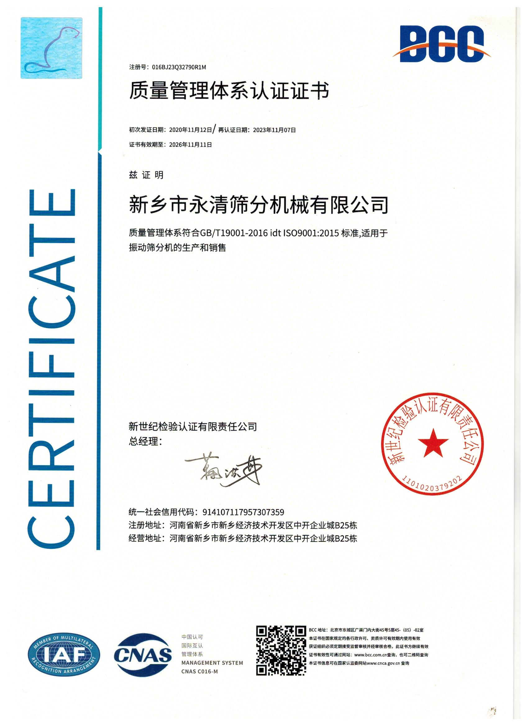 質量管理體系認證證書