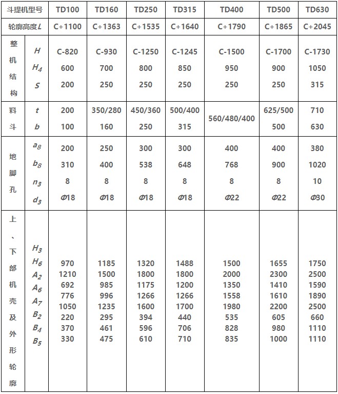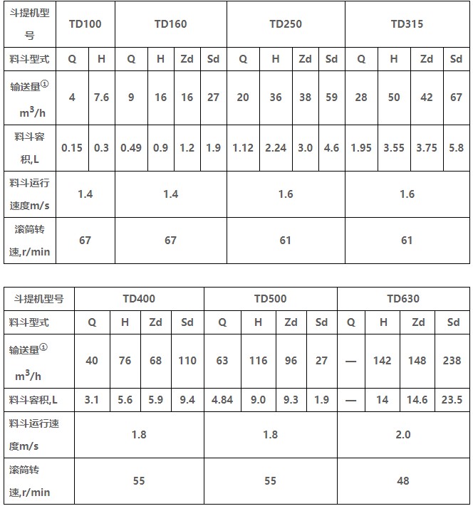 TD型垂直斗式提升機(jī)由運行部分(料斗與牽引膠帶)、帶有傳動滾筒的上部區(qū)段、帶有拉緊滾筒的下部區(qū)段、中間機(jī)殼、驅(qū)動裝置、逆止制動裝置等組成,適用于向上輸送松散密度ρ<1.5t/m3粉狀、粒狀和小塊狀的無磨琢性和半磨琢性散狀物料,如煤、砂、焦末、水泥、碎礦石等。本機(jī)的特點為快速離心卸料:并采用橡膠輸送帶為牽引構(gòu)件,故不適于輸送大塊磨琢性及掏取阻力大的物料。被輸送物料的溫度不得超過60℃,如采用耐熱橡膠帶時溫度不超過200℃。與D型斗式提升機(jī)相比,具有輸送效率高,料斗型式多等特點。