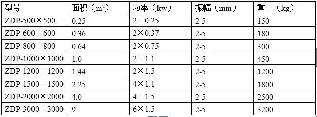 注:此表為上、下振形式振動(dòng)平臺(tái)技術(shù)參數(shù),僅供參考;此外可以根據(jù)用戶實(shí)際使用需要定做臺(tái)面大小來選用振動(dòng)電機(jī)數(shù)量及功率。